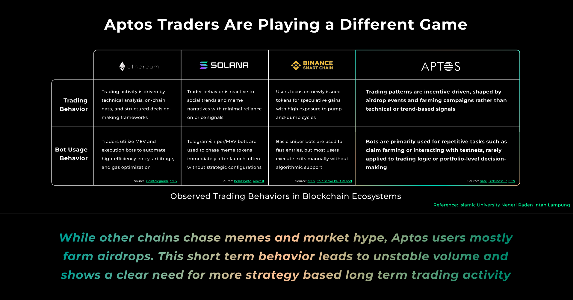 Without advanced infrastructure or composable tools, Aptos remains behind in cultivating trader behavior that is strategic, repeatable, and scalable.